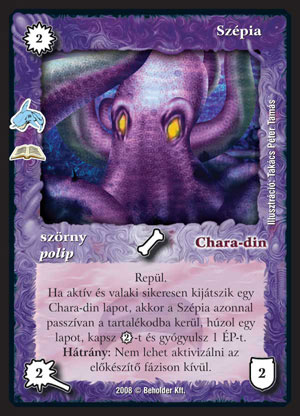 Szépia (9): Chara-din önmagában nem a legjobb szín, s azok a paklik, melyek erősen építenek rá, szintén kevésbé ütősek, mivel az utóbbi időben, kissé el lett hanyagolva a lila szín. Ezen a problémán a Szépia sokat fog segíteni, s a Tengermélyben is szép számban jelennek meg lapok, melyek a lilás koncepciókat hozzák előtérbe. Sajnos egy nagyon jó lapra (Martian memoárja) még várnunk kell 2-4 hónapot, ugyanis egy későbbi Zénben fog megjelenni, s igen hatékony volt, de remélhetőleg nélküle is életképes paklik születnek. A Szépia önmagában semmit nem fog csinálni, de megfelelő pakliban körönként ad két VP-t, s húzat egy lapot. Ez pár kör alatt szép kis előnyt csinál. Mindenképpen érdemes néhány olcsó lapot is berakni mellé, hogy rögtön a második körben is ki tudjuk használni; a Kifordított varázsdoboz az egyik legjobb. Fattyas, thargodanos, orglingos pakliba kötelező lesz, de egyéb koncepciókkal is érdemes kísérletezni, szerintem egész ütőképes Kyorg paklit is lehet majd összerakni, amiben szinte csak lila lapok vannak.
