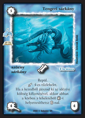 Tengeri sárkány (5): Hiába jobb, mint egy pegazus, az 5-ért 4/4-es repülő lény már igencsak gyengécske. Igaz, a lehelete már egész csábítónak tűnik, de sajnos csak a kijátszási körében köphetünk oda hármat ingyen, később sajna fizetni kell ezért. Ráadásul ezt csak akkor tehetjük meg, ha 5 VP-t fektettünk be, ami eleve kizárja, hogy pl. sárkány pakliba berakjuk. |