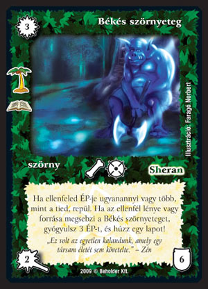 Békés szörnyeteg (8): Megkeserítette az életedet a sok agresszív lény? Akkor most végre nyugodtan alhatsz, hisz eljött közénk a Békés szörnyeteg! Ha már kicsit megkarcoltak az ellenfél lényei, akkor már a lomhasága sem lehet akadály, azon nyomban szétkenhet valami gyengébb lényt (mondjuk egy Elkorcsosult sziránuszt vagy egy Kelegisht), vagy csak simán üttetheti magát egy lényen, amit nem tud leütni. Nemcsak egy nehezen áthágható akadály az agresszoroknak de kiváló gyógyulás és erőforrás is. Ha egyszer elkezd működni, akkor jaj az ellenfélnek.