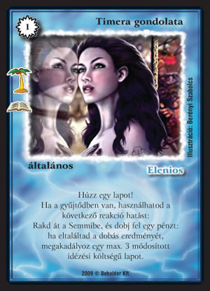 Timera gondolata (9): Az ezredik Timerás lap a játékban, a legtöbbjük nem futott be nagy pályát, de talán ezt majd jóval többször látjuk viszont. A lappal kapcsolatban szerintem három eshetőséget érdemes vizsgálni, ez alapján tudjuk belőni az értékét. Első esetben kijátszuk, húzunk egyet, majd nem sikerül counterelés. Ez ugye elég szomorú eset, börtön, Lassan járj mellett már óriási a veszteség. Második eset - ha sikerül a counterelés - már sokkal jobban hangzik, szerintem ekkor bőven megéri az árát; még börtön és járj mellett is. S ami szerintem a legérdekesebb: előfordulhat, hogy nem kézből játsszuk ki, hanem egyéb módon kerül a gyűjtőbe. Ez már szerintem óriási haszon, hisz teljesen ingyen kaptunk egy 50%-os lapcountert. Szerintem ezen harmadik opció miatt érdemes egyáltalán ezzel a lappal játszanunk, tehát ha berakjuk, akkor mindenképpen legyen szerves része a paklinknak a pakliból dobatás (pl. Víziós pakli) vagy a kézből dobálgatás (ha sok, Teknős gárdista jellegű lapunk van).