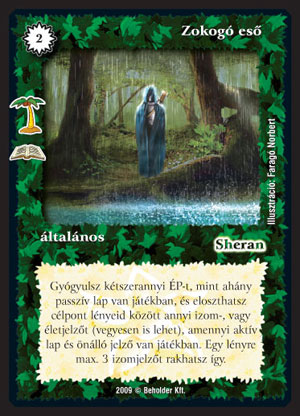 Zokogó eső (7): Szépen és jól hangzik, de nem egészen fér a fejembe, hogy milyen pakliba fog végül bekerülni. Gyógyítása szerintem egyértelműen a másodlagos képessége, hiszen milyen formában építhetnénk rá? Van sok passzív lapunk aztán gyógyulunk velük 10-et? Valószínűleg az az 5 passzív lap már nagyságrendekkel hasznosabb dolgot csinált, így ilyen vonalat kár is erőltetni. Az izmok kiosztása már érdekesebb téma, nemcsak könnyebben teljesítető, de még hasznosabb is. Lényekkel vélhetőleg rendelkezni fogunk, ha már játszunk a Zokogó esővel, s rögtön be is számítanak az izomba. (Ugye már senki se játszik passzív lényekkel? J). Plusz haszonként bele számíthatjuk az ellenfél aktív lapjait (melyekből sokkal nagyobb eséllyel rendelkezik, mint a passzívból). Egy jól kiterült asztalnál egész jól meg tudjuk tápolni a kedves lényeinket.