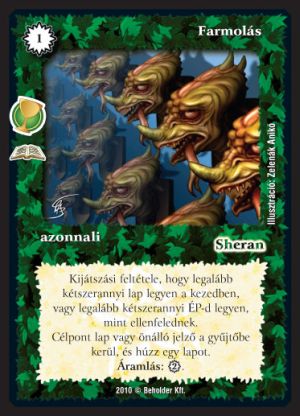 Farmolás (7): Szép nagy feltétel az amúgy igen táposnak tetsző lapon. Véleményem szerint nincs igazán egyensúlyban a két része a dolognak, hiszen nem annyira egyszerű a sok ÉP-t vagy lapot összehozni, és azért annyira nem meghökkentően nagy dolog egyért, cantripbe leszedni valamit. Ha dupla annyi ÉP-nk van, az azt feltételezi, hogy agresszív paklival játszunk (hisz gyorsan rámegyünk az ellenfél ÉP-jére), s akkor a jó startot bizony igencsak hátráltathatja egy kijátszhatatlan lap, így ez a megoldás nem látszik elég jónak. Ha az erőforrás fölényre törekszünk, már jobbnak tűnik a dolog, nem olyan bonyolult összehozni a szükséges lapmennyiséget. Főleg, ha az ellenfél pakolja a lapjait, mint egy őrült. Így megvizsgálva tehát azt lehet mondani, hogy a sidelap bizonyos paklik ellen, kontroll jellegű koncepcióba.