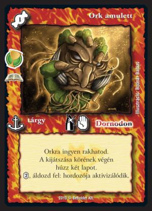 Ork amulett (8): Hoppá! A várva várt Ork amulett végre megjelent. Megfelelő pakliban (minő meglepetés - ork pakliban) igazán jó erőforrás, ingyen két lap, ráadásul marad egy áldozható lapunk is. Ennek az Ork hadisámán, Gépezet (új) és egyéb áldozós lapok miatt van komoly szerepe. Itt az ideje, hogy összeszedjük az orkokat, végre egész jó paklit lehet szerkeszteni belőlük. Talán még azt is megsúghatom, hogy a decemberi kiegészítőben ismét lesz új ork szép számmal...