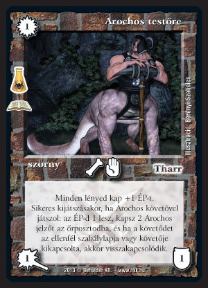 Arochos testőre (8): Az lap nálam 8 pontot kap, ami egy pakliba jó csak, de oda nagyon jó, és az a pakli versenyerős. Ez is egy ilyen kártya. Gondolom, nem kell leírnom, milyen pakliba illik. Alapból is érdemes használni, nem csak kiegészítőből, főleg, mivel megvéd a nagy mumustól, Az óriások földjétől. Nem is érdemes rá sok szót vesztegetni. A tesztelésen még +1/+1-et adott, úgy erősnek találtuk. Szerintem így is jó Arochos mellé.