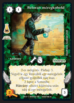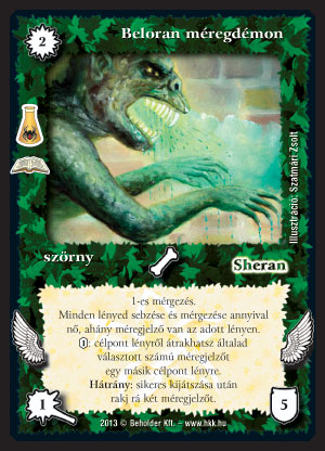 Beloran méregdémon (8): Az önmagukat mérgező lények egy kellemes ki önálló paklit alkotnak most, hogy több lap is megjelent hozzájuk. Mérgező rakshallionnal, Eleven méreggel, Rothadó borzalommal és most megjelent önmérgező lapokkal egész jó paklit próbálgattam (én is és más tesztelő is) a tesztelésen. Ebbe a méregdémon egy kötelező lap volt. Kijátszásakor egy 2-ért 3/5-ös lény, ami nem nagy szám, de van egy beépített Méregfélelem-szerű képessége, ráadásul a méregjelzőket is úgy pakolgathatjuk vele, ahogy szeretnénk. Szerintem ebbe a pakliba combos lap.
