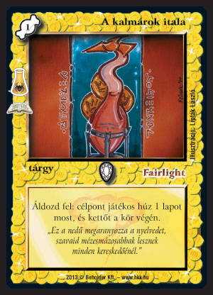 A kalmárok itala (8): Egy komponensért három lapoz húzni jó dolog. A tesztelés elején még egyből húzta a lapokat, akkor még jobb volt. J Most, a végső verzióban kettőt csak kör végén húzunk fel, ami azért gyengít a lapon, mivel kevésbé lehet pörögni vele. Tárgyak mellé, Lépéselőny mellé, vagy egyes speciális paklikba (pl. Fairlight pakli) még így is használható lap, de szerintem így nem lesz nagy játékformáló hatása.
