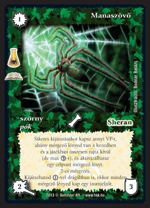 Manaszövő (9): A mérgező pakli minden verziójába (önmérgező, sima mérgező, Sheran követő, pókos móka, bármi) a legalapabb alap lap. J Az első körben elindíthatjuk vele a lapok kipörgetését. Sheran ékköve mellett jöhet egyből izommal. Még manapság is sokan használják A pokol szemét, ami egyért ad három VP-t. Az új Manaszövő, igaz speciálisabb pakliban, de lényként adja mindezt. Nehezebb ellenvarázsolni, nem lehet lelőni, mielőtt megadja a VP-t, és marad még egy mérgező lényünk is az asztalon. Az első körben 3 VP könnyen 3 újabb lap kirakását eredményezheti, főleg ha van az előbb említett Sheran ékkövéből is egy a kezünkben. Jó papír ez!
