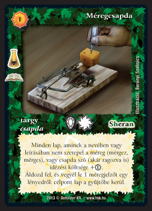 Méregcsapda (7): Ez egy speciális Törzsi dob. Igaz, nincs meg neki a passzivizálós képessége, de olyan paklikban (csapda, mérgező) használható, ahová a Törzsi dob nem lenne jó. A Törzsi dob szerintem egy nem nagyon erős, de versenyen is használható lap, ami a Világégés megjelenésével, és az ettől remélt etnikum paklik előre törésével tovább erősödik. A Méregcsapda az önmérgező pakliban még leszedésként is funkcionálhat, nem verseny erős csapdapakliban pedig hármat tud sebezni. Megfelelő helyzetben ne feledjük az ősmágiáját sem! Összességében egy használható, de nem igazán erős lapról van szó, ami környezettől függően kerülhet csak bele még a saját 2-3-féle paklijába is.