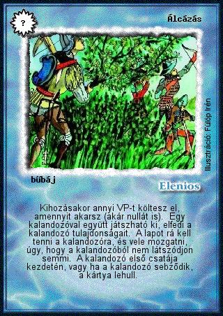 Szöveg: Kihozásakor annyi VP-t költesz el, amennyit akarsz (akár nullát is). Egy kalandozóval együtt játszható ki, elfedi a kalandozó tulajdonságait. A lapot rá kell tenni a kalandozóra, és vele mozgatni, úgy, hogy a kalandozóból nem látszódjon semmi. A kalandozó első csatája kezdetén, vagy ha a kalandozó sebződik, a kártya lehull.