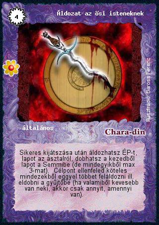 Kiadás: Rhatt fénykora Gyakoriság: ritka Lapszín (isten): Chara-din Típus: általános Szöveg: Sikeres kijátszása után áldozhatsz ÉP-t, lapot az asztalról, dobhatsz a kezedből lapot a Semmibe (de mindegyikből max 3-mat). Célpont ellenfeled köteles mindezekből eggyel többet feláldozni ill. eldobni a gyűjtőbe (ha valamiből kevesebb van neki, akkor csak annyit, amennyi van). Illusztráció: Baross Ferenc