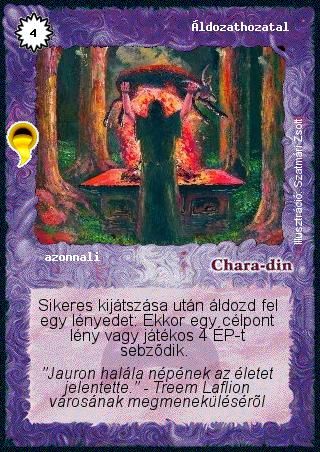 Kiadás: Aranyforrás, Túlélők Földje Gyakoriság: gyakori Lapszín (isten): Chara-din Típus: azonnali Szöveg: Sikeres kijátszása után áldozd fel egy lényedet: Ekkor egy célpont lény vagy játékos 4 ÉP-t sebződik. Szinesítő szöveg: "Jauron halála népének az életet jelentette." - Treem Laflion városának megmeneküléséről Illusztráció: Szatmári Zsolt