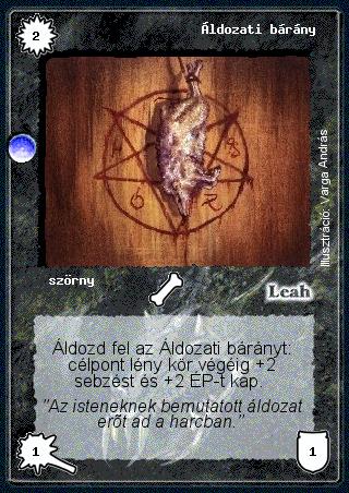 Kiadás: Árnyékhold Gyakoriság: gyakori Lapszín (isten): Leah Típus: szörny Szöveg: Áldozd fel az Áldozati bárányt: célpont lény kör végéig +2 sebzést és +2 ÉP-t kap. Szinesítő szöveg: "Az isteneknek bemutatott áldozat erőt ad a harcban." Illusztráció: Varga András