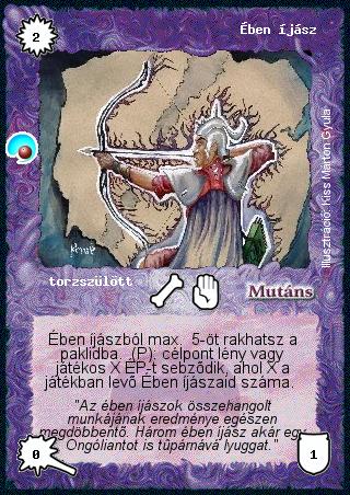 Szöveg: Ében íjászból max. 5-öt rakhatsz a paklidba. (P): célpont lény vagy játékos X ÉP-t sebződik, ahol X a játékban levő Ében íjászaid száma.