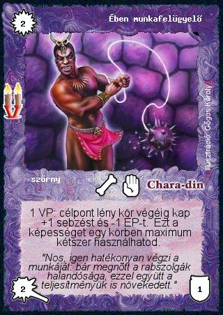 Kiadás: Régmúlt, Alappakli, 8. kiadás Gyakoriság: gyakori Lapszín (isten): Chara-din Típus: szörny Szöveg: 1 VP: célpont lény kör végéig kap +1 sebzést és -1 ÉP-t. Ezt a képességet egy körben maximum kétszer használhatod. Szinesítő szöveg: "Nos, igen hatékonyan végzi a munkáját: bár megnőtt a rabszolgák halandósága, ezzel együtt a teljesítményük is növekedett." Illusztráció: Gőgös Károly