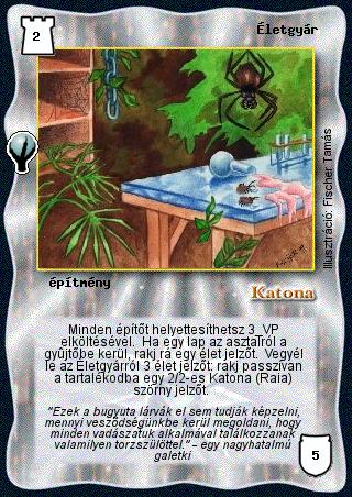 Szöveg: Minden építőt helyettesíthetsz 3 VP elköltésével. Ha egy lap az asztalról a gyűjtőbe kerül, rakj rá egy élet jelzőt. Vegyél le az Életgyárról 3 élet jelzőt: rakj passzívan a tartalékodba egy 2/2-es Katona (Raia) szörny jelzőt.