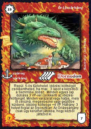 Szöveg: Repül. 5-ös tűzlehelet. Idézési költségét csökkentheted, ha max. 3 lapot a kezedből a Semmibe dobsz. Minden egyes lap dobása 3 VP-vel csökkenti az idézési költségét. Minden varázslat vagy hatás, mely őt célozná, megsebezné vagy gyűjtőbe küldené, idézési költsége +4 VP. Hátrány: 3 helyet foglal az őrposztban. Az Óriássárkány csak úgy kerülhet játékba, hogy kézből játszod ki.