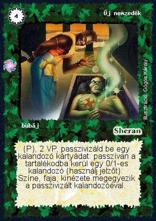 Kiadás: Létsíkok Gyakoriság: nem gyakori Lapszín (isten): Sheran Típus: bűbáj Szöveg: (P), 2 VP, passzivizáld be egy kalandozó kártyádat: passzívan a tartalékodba kerül egy 0/1-es kalandozó (használj jelzőt). Színe, faja, kinézete megegyezik a passzivizált kalandozóéval. Illusztráció: Gőgös Károly