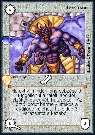 Kiadás: Árnyékhold, Túlélők Földje Gyakoriság: ritka Lapszín (isten): Színtelen Típus: szörny Szöveg: Ha aktív, minden lény sebzése 0, függetlenül a rátett lapoktól, jelzőktől és egyéb hatásoktól. Az őrző lordot bármely játékos a gyűjtőbe küldheti, ha eldob 3 varázslatot a kezéből. Illusztráció: Fischer Tamás