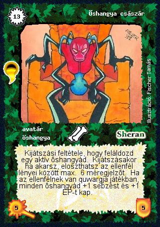 Szöveg: Kijátszási feltétele, hogy feláldozd egy aktív őshangyád. Kijátszásakor ha akarsz, eloszthatsz az ellenfél lényei között max. 6 méregjelzőt. Ha az ellenfélnek van quwargja játékban, minden őshangyád +1 sebzést és +1 ÉP-t kap.
