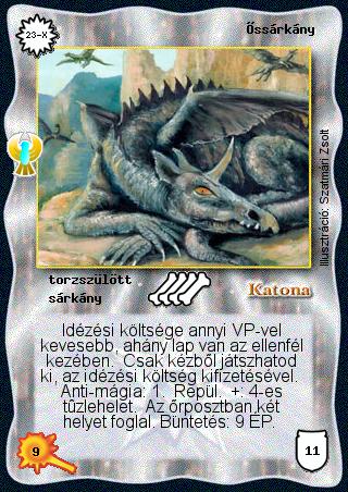 Szöveg: Idézési költsége annyi VP-vel kevesebb, ahány lap van az ellenfél kezében. Csak kézből játszhatod ki, az idézési költség kifizetésével. Anti-mágia: 1. Repül. +: 4-es tűzlehelet. Az őrposztban két helyet foglal. Büntetés: 9 ÉP.