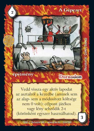 Kiadás: Ezüsthajnal, Túlélők Földje Gyakoriság: ritka Lapszín (isten): Dornodon Típus: építmény Szöveg: Vedd vissza egy aktív lapodat az asztalról a kezedbe (nem lehet az idézési költsége 0, még módosítva sem): Célpont játékos vagy lény sebződik 2 ÉP-t. Ezt a képességet egy körben csak egyszer használhatod. Illusztráció: Csikós György