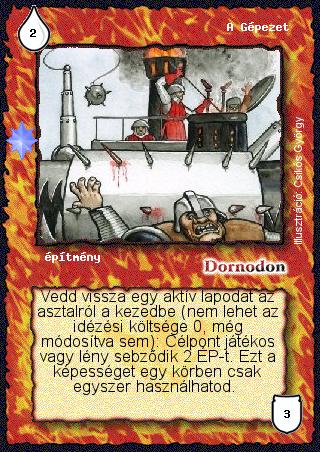 Hatalom Kártyái kártyalap - A Gépezet| (AK35) A Gépezetet nem játszhatom ki Morpetlanik darujával, mivel A Gépezet idézési költsége - annak ellenére, hogy épület - nem építő, hanem áldozás. | | (AK36) A Kísérteties bajnokkal visszahozott lény minden szempontból normálisan viselkedik, kivéve, hogy a kör végén mindenképpen a gyűjtőbe kerül, de csak akkor, ha még az asztalon van. Ha valamilyen hatással (pl. A Gépezet) visszaveszem a kezembe, akkor már nem tud a gyűjtőbe kerülni. | | (AK37) A Gépezet szövege hibás. A helyes szöveg a "Vedd vissza egy aktív lapodat az asztalról a kezedbe" helyett a "Egy aktív lapod az asztalról visszakerül a tulajdonosa kezébe". Tehát, ha például elbűvölöm az ellenfél lényét, és azt használom A Gépezethez, akkor a lény az ellenfelem kezébe kerül vissza. | | (AK53) Visszavehetem a Trükkös csellel saját magát (ld. A Gépezet). Az ellenfél lapjait pedig ő választja ki. | | (AK56) Visszavehetem A Gépezettel a Templomi orgonát, ha ingyen játszottam ki, mivel volt egy templomom játékban. A Gépezettel nem vehetsz vissza olyan lapot, aminek az idézési költsége 0. Ez azonban az alap idézési költségre vonatkozik, ami az orgonánál három. A Templomi orgonának csak a módosított idézési költség 0, mivel a templom csökkenti a kijátszási költségét. |