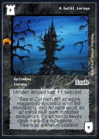 Kiadás: Chara-din visszatér Gyakoriság: gyakori Lapszín (isten): Leah Típus: építmény Altípus: torony Szöveg: Minden lényed kap +1 sebzést. Szinesítő szöveg: "Baa el Zul nem félt az egyre magasodó épülettől, nem félt mindaddig, míg fel nem épült, és az orkok neki nem rontottak seregének. És azután is kevés ideje maradt a rettegésre..." - Treem az arkheoni csatáról Illusztráció: Mojzer Krisztina