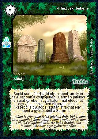 Kiadás: Víziók Gyakoriság: nem gyakori Lapszín (isten): Tudós Klán Típus: bűbáj Szöveg: Senki sem játszhat ki olyan lapot, amilyen nevű lap van a gyűjtőjében. Bármely játékos a saját körében egy alkalommal eldobhat egy véletlenszerűen válaszott lapot a kezéből a gyűjtőbe, ezután átrakhat egy lapot a gyűjtőjéből a Semmibe. Szinesítő szöveg: "...mától legyen eme lélek jutalma örök béke, nem háborgathatják álmát többé sem a valós világ, sem a víziók világának erői. Az ősök őrködjenek felette!" - Arthiux atya gyászbeszéde Illusztráció: Szász Gábor