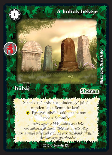 Kiadás: Örökkévalóság Gyakoriság: nem gyakori Lapszín (isten): Sheran Típus: bűbáj Altípus: - Szöveg: Sikeres kijátszásakor minden gy?jt?b?l minden lap a Semmibe kerül. (P): Egy gy?jt?b?l átrakhatsz három lapot a Semmibe. Szinesítő szöveg: "...mától legyen e lélek jutalma örök béke, nem háborgatják álmát többé sem a valós világ, sem a víziók világának er?i. Az ?sök ?rködjenek felette!" - Arthiux atya gyászbeszéde Illusztráció: Szász Gábor