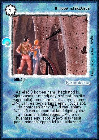 Kiadás: Két világ közt Gyakoriság: nem gyakori Lapszín (isten): Pszionicista Klán Típus: bűbáj Szöveg: Az első 3 körben nem játszhatod ki. Kijátszásakor mondj egy számot (pozitív vagy nulla), ami nem lehet annyi, ahány ÉP-d van, és tégy a lapra ennyi jövőjelzőt. Ha pontosan annyi ÉP-d van, ahány jövőjelző van a lapon, akkor felgyógyulsz a maximális lehetséges ÉP-dre és húzhatsz egy lapot, A jövő alakítását pedig mindenképpen fel kell áldoznod. Illusztráció: Fischer Tamás