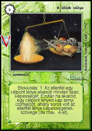 Kiadás: Legendák Völgye, Alappakli, 8. kiadás Gyakoriság: nem gyakori Lapszín (isten): Rhatt Típus: azonnali Szöveg: Blokkolás: 1. Az ellenfél egy célpont lénye elveszti minden spec. képességét. Ezután ha akarod, egy célpont lényed kap annyi izomjelzőt, ahány soros volt az ellenfél lénye képességének szövege (de max. 4-et). Illusztráció: Szatmári Zsolt