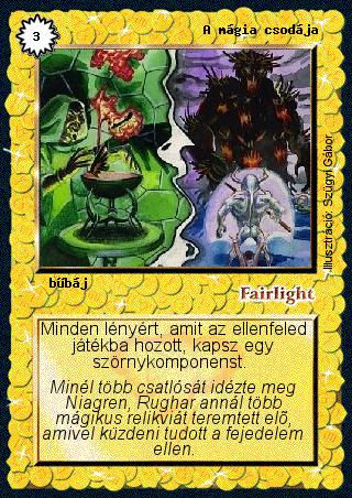 Kiadás: Alappakli, 2. kiadás, Alappakli, 3. kiadás, Alappakli, 4. kiadás Gyakoriság: ritka Lapszín (isten): Fairlight Típus: bűbáj Szöveg: Minden lényért, amit az ellenfeled játékba hozott, kapsz egy szörnykomponenst. Szinesítő szöveg: Minél több csatlósát idézte meg Niagren, Rughar annál több mágikus relikviát teremtett elő, amivel küzdeni tudott a fejedelem ellen. Illusztráció: