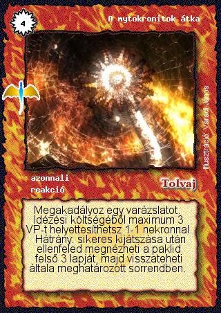 Szöveg: Megakadályoz egy varázslatot. Idézési költségéből maximum 3 VP-t helyettesíthetsz 1-1 nekronnal. Hátrány: sikeres kijátszása után ellenfeled megnézheti a paklid felső 3 lapját, majd visszateheti általa meghatározott sorrendben.