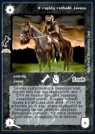 Szöveg: Sikeres kijátszásakor a lovasokon kívül minden lény kap egy ragályjelzőt, ami -1 ÉP-t és minden speciális képesség elvesztését jelenti. A ragály rothadó lovasa a kijátszása után annyi +1/+1-es erősödés jelzőt kap, ahány ragályjelző és betegség lap van játékban összesen. Betegségre immúnis. Ha nincs játékban ilyen lovas, a ragályjelzők is leesnek.
