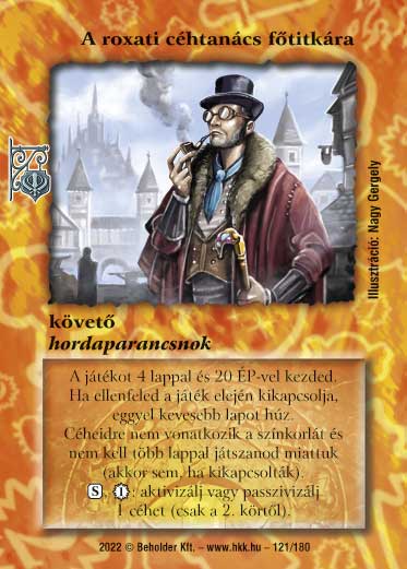 Kiadás: Roxat céhei Gyakoriság: nem gyakori Lapszín (isten): Színtelen Típus: követő Altípus: hordaparancsnok Szöveg: A játékot 4 lappal és 20 ÉP-vel kezded. Ha ellenfeled a játék elején kikapcsolja, eggyel kevesebb lapot húz. Céheidre nem vonatkozik a színkorlát és nem kell több lappal játszanod miattuk (akkor sem, ha kikapcsolták). (S), 1_VP: aktivizálj vagy passzivizálj 1 céhet (csak a 2. körtől). Illusztráció: Nagy Gergely