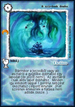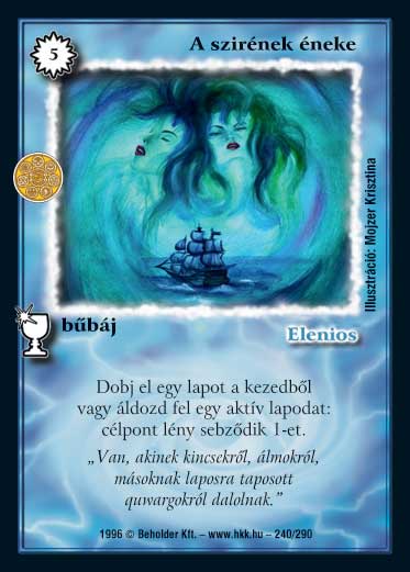 Szöveg: Bármikor a kezedből vagy az asztalról a gyűjtőbe dobhatod egy lapodat (de jelzőt nem!). Az asztalról csak aktív lapot dobhatsz. Minden így eldobott lappal 1 pontnyi sebzést okozhatsz célpont lénynek. (Két szirének énekének a hatása nem adódik össze. ).
