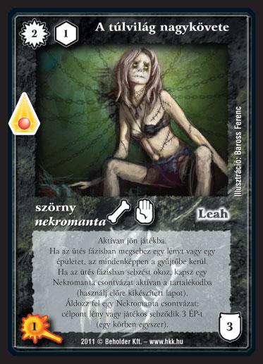 Kiadás: Zanszilánkok Gyakoriság: ritka Lapszín (isten): Leah Típus: szörny Altípus: nekromanta Szöveg: Aktívan jön játékba. Ha az ütési fázisban megsebez egy lényt vagy egy épületet, az mindenképpen a gyűjtőbe kerül. Ha az ütés fázisban sebzést okoz, kapsz egy Nekromanta csontvázat aktívan a tartalékodba (használj előre kikészített lapot). Áldozz fel egy Nekromanta csontvázat: célpont lény vagy játékos sebződik 3 ÉP-t (egy körben egyszer). Illusztráció: Baross Ferenc