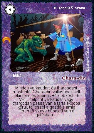 Szöveg: Minden varkaudart és thargodant mostantól Chara-din vallásúnak kell tekinteni, és kapnak +1 sebzést. 5 VP: célpont varkaudar vagy thargodan passzívan a tartalékodba kerül, te leszel a gazdája amíg Teremtő szava bűbájod van a játékban.