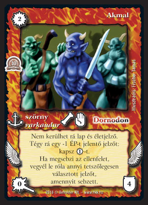 Kiadás: Rhatt fénykora, Alappakli, 10. kiadás Gyakoriság: gyakori Lapszín (isten): Dornodon Típus: szörny Altípus: varkaudar Szöveg: Repül. Nem kerülhet rá lap és életjelző. Tégy rá egy -1 ÉP-t jelentő jelzőt: kapsz 1 VP-t. Ha megsebzi az ellenfelet, vegyél le róla annyi tetszőlegesen választott jelzőt, amennyit sebzett. Illusztráció: Fischer Tamás