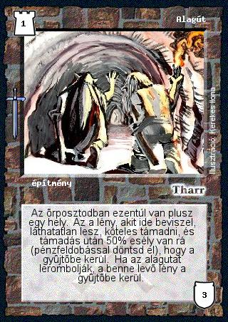Szöveg: Az őrposztodban ezentúl van plusz egy hely. Az a lény, akit ide beviszel, láthatatlan lesz, köteles támadni, és támadás után 50% esély van rá (pénzfeldobással döntsd el), hogy a gyűjtőbe kerül. Ha az alagutat lerombolják, a benne levő lény a gyűjtőbe kerül.