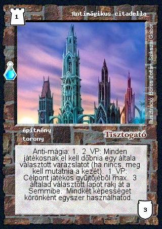 Szöveg: Anti-mágia: 1. 2 VP: Minden játékosnak el kell dobnia egy általa választott varázslatot (ha nincs, meg kell mutatnia a kezét). 1 VP: Célpont játékos gyűjtőjéből max. 3 általad választott lapot rakj át a Semmibe. Mindkét képességet körönként egyszer használhatod.