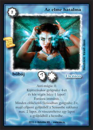 Kiadás: Zarknod visszatér Gyakoriság: ultra ritka Lapszín (isten): Elenios Típus: bűbáj Szöveg: Anti-mágia: 0. Kijátszásakor gyógyulsz 4-et és kör végén húzz 1 lapot! Forrásra immúnis. A rárakott jelzőkre források nem hatnak. Minden előkészítő fázisodban gyógyulsz 2-t, majd célpont gyűjtőből a Semmibe rakhatsz max. 2 lapot, és visszavehetsz egy lapot a gyűjtődből a kezedbe. Illusztráció: Váradi János