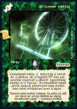 Szöveg: Késleltetett hatás, 2: áldozd fel a rokkát: Az a játékos, aki a legtöbb ÉP-ben van, azonnal megnyeri a játékot, egyenlőség esetén is te nyersz. A késleltetett hatás jelzők számát semmilyen más módon nem lehet módosítani ezen a lapon.