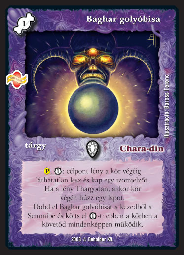 Kiadás: Tengermély Gyakoriság: ritka Lapszín (isten): Chara-din Típus: tárgy Szöveg: (P), 1_VP: célpont lény a kör végéig láthatatlan lesz és kap egy izomjelz?t. Ha a lény Thargodan, akkor kör végén húzz egy lapot. Dobd el Baghar golyóbisát a kezedb?l a Semmibe és költs el 1_VP-t: ebben a körben a követ?d mindenképpen m?ködik. Illusztráció: Baross Ferenc