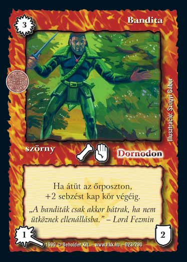 Kiadás: Aranyforrás, Túlélők Földje Gyakoriság: gyakori Lapszín (isten): Dornodon Típus: szörny Szöveg: Ha átüt az őrposzton, +2 sebzést kap a kör végéig. Szinesítő szöveg: "A banditák csak akkor bátrak, ha nem ütköznek ellenállásba." - Lord Fezmin Illusztráció: