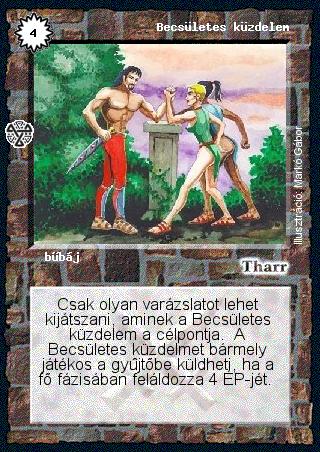 Szöveg: Csak olyan varázslatot lehet kijátszani, aminek a Becsületes küzdelem a célpontja. A Becsületes küzdelmet bármely játékos a gyűjtőbe küldheti, ha a fő fázisában feláldozza 4 ÉP-jét.