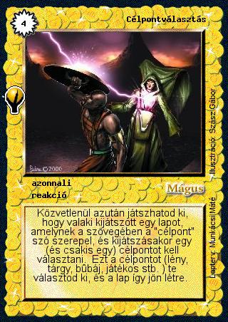 (AK59) Ha az ellenfél Tisztítótüzét egy Célpontválasztással átirányítom egy büntetéses lényembe, az ellenfél szenvedi el a büntetést. A lényem ugyanis nem a Célpontválasztástól, hanem a Tisztítótűztől hal meg. A Tisztítótüzet pedig az ellenfelem játszotta ki. | (AK63) Egy ellenvarázslat csata végén megtehetem azt a Célpontválasztással, hogy az ellenfél Ellenvarázslatának új célpontot választok, mégpedig a saját varázslatát, mivel a Célpontválasztás olyan lapokra működik, amiknek a szövegében a célpont szó szerepel, és egy lapra hat. Minden azonnali reakció lapra is működik tehát, amik eleget tesznek a fenti feltételeknek. Fontos azonban, hogy a Célpontválasztással kiválasztott új célpontnak is legálisnak kell lennie, tehát pl. egy Agybénítást nem irányíthatok át egy általános varázslat megakadályozására, illetve nem irányíthatok át egy varázslatot saját magára. | (AK66) Az ellenfél kijátssza két varázspontért a Végképp eltörölnit a Molgant nevezve meg célpontként. Miután ennek a Tharr lapnak a célpontja bármilyen lény lehet, ezért én a Célpontválasztással átirányíthatom akár kalandozóba, akár galetkibe, avatárba stb. Az átirányítás után a lap hatása az lesz, hogy az X, jelen esetben kettő, idézési költségű lény a Semmibe kerül. Ha a Troll ladybe irányítom, akkor nem történik semmi, mivel annak az idézési költége három. Ha a Bölcs tanítóba irányítottam, akkor az meghal, mivel neki szintén kettő az idézési költsége. | (AK66) Ellenfelem Lohd Haven hikoltásával akarja megakadályozni a Mandulanektáromat. Átirányíthatom a hiklotást egy Célpontválasztással egy, az asztalon levő Rovarsámánra, mivel az is legális célpontja lehet a hikoltásnak. Ugyanez az eset A gyenge ereje, Az erős gyengéje stb. lapoknál. Ha ellenvarázslatként játssza ki az ellenél, átirányíthatjuk egy tetszőleges lénybe, hogy sebezzen. | (AK66) Korábbi rovatunkban az szerepelt, hogy a Célpontválasztás hat az ellenvarázslatokra, ha azoknak érvényes új célpontot tudunk választani. Természetesen ez csak abban az esetben igaz, ha az adott ellenvarázslat szövegében szerepel a célpont szó. | (AK76) A Célpontválasztás csak annyit csinál, hogy a varázslat célpontját megváltoztatja, a varázslat egyéb paraméterei nem változnak. Mivel a Manaszívás célpont ellenfélre vonatkozik, ezért kétszemélyes játékban még a célpontját sem tudod megváltoztatni. | (AK81) Ha egy Zombira kijátszott Negatív energiámat Célpontválasztással átirányít az ellenfelem az én Agglomerátoromba, akkor öt életpontot kell áldoznom. A Negatív energia szövege szerint ugyanis a lap sikeres kijátszása után kell annyi életpontot áldoznom, amennyi a célpont idézési költsége. Mivel a Célpontválasztás reakció, ezért még a sikeres kijátszás előtt megváltoztatja a célpontot. Vagyis a Negatív energia célpontja a sikeres kijátszáskor már az Agglomerátor, így öt életpontot kell áldoznom, és a lény a gyűjtőbe kerül. | (AK81) Ha kijátszok egy Manasajtolást, az ellenfelem pedig Célpontválasztással átirányítja magára, akkor mivel nem a lap célpontja sebződik és a lap hatását sem ő választja meg, ezért a Célpontválasztás csak azt befolyásolja, hogy ki húzza a lapokat, vagy ki kap manát. Sebződni és választani továbbra is a lap kijátszója fog. |