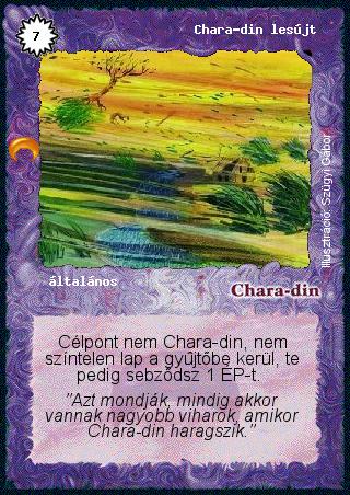 Kiadás: Chara-din visszatér, Túlélők Földje Gyakoriság: gyakori Lapszín (isten): Chara-din Típus: általános Szöveg: Célpont nem Chara-din, nem színtelen lap a gyűjtőbe kerül, te pedig sebződsz 1 ÉP-t. Szinesítő szöveg: "Azt mondják, mindig akkor vannak nagyobb viharok, amikor Chara-din haragszik." Illusztráció: