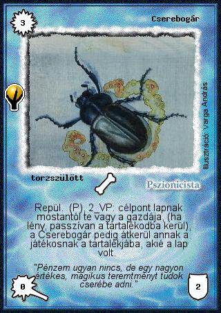 Kiadás: Alappakli, 5. kiadás (Ősök városa) Gyakoriság: ritka Lapszín (isten): Pszionicista Klán Típus: torzszülött Szöveg: Repül. (P), 2 VP: célpont lapnak mostantól te vagy a gazdája, (ha lény, passzívan a tartalékodba kerül), a Cserebogár pedig átkerül annak a játékosnak a tartalékjába, akié a lap volt. Szinesítő szöveg: "Pénzem ugyan nincs, de egy nagyon értékes, mágikus teremtményt tudok cserébe adni." Illusztráció: Varga András
