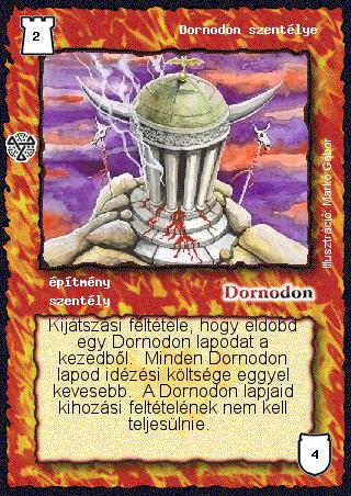 Szöveg: Kijátszási feltétele, hogy eldobd egy Dornodon lapodat a kezedből. Minden Dornodon lapod idézési költsége eggyel kevesebb. A Dornodon lapjaid kihozási feltételének nem kell teljesülnie.